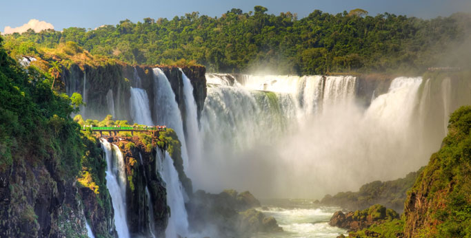 Na světě je řada monumentálních míst, kde voda divoce přepadává přes hranu řek. Málokteré se však vyrovná největším vodopádům světa Iguazú. Najdete je přímo na hranici Argentiny a Brazilie v oblasti subtropického deštěného pralesa a národního parku Iguazú Falls. Vytvořila je stejnojmenná řeka a jejich šířka čtyřikrát přesahuje slavné Niagarské vodopády. Nejvyšší spojený vodopád se řítí z výšky 85 metrů do průrvy zvané „Ďáblův chřtán“. Těm šťastlivcům, kteří je spatří, se vizuální i akustický zážitek burácející vodní tříště zaryje do paměti na hodně dlouho. Podnikněte jednodenní výlet po obou stranách vodopádu, brazilské i argentinské, a určitě se zastavte v městě Puerto Iguazu, které leží v místě známém Tres Fronteras (tři hranice), kde se setkává Brazílie, Paraguay a Argentina. Navštivte také most Tancredo Neves spojující město s Brazílií, nebo třeba známé Muzeum obrazů džungle Mborore.