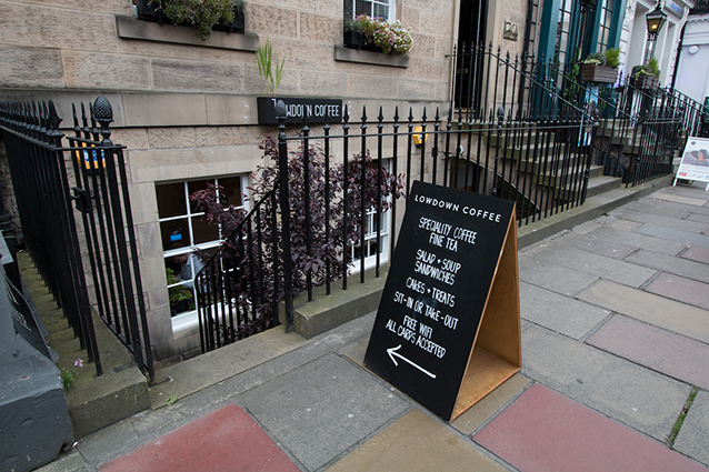 [Cedule s pozvánkou do kavárny Lowdown Coffee v Edinburgu.]