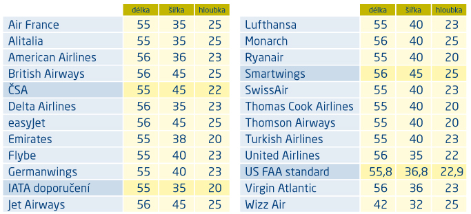Přehled povolených velikostí příručních zavazadel (v cm)